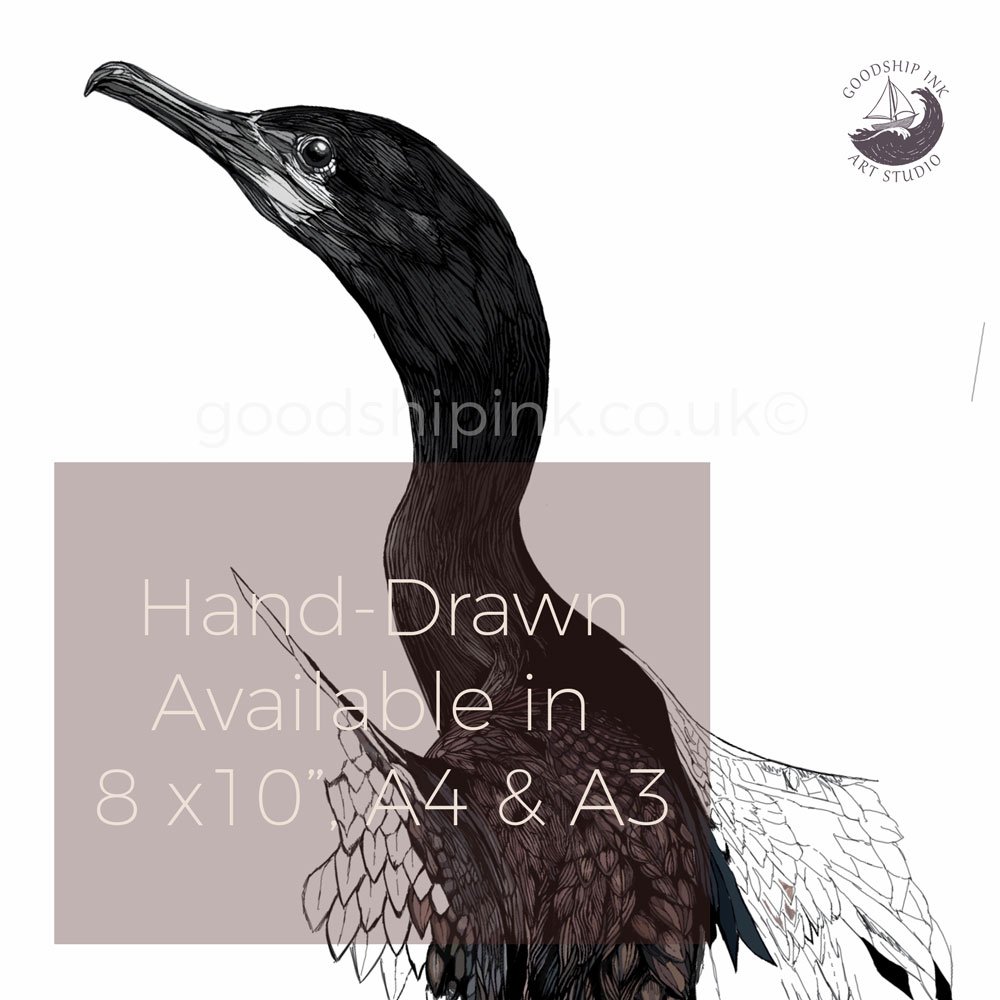 Cormorant Art Print, Limited Edition Giclée Print – Hand-drawn Bird Illustration of a British Seabird, Coastal Wildlife Wall Art. Available in A4/A3/8×10.