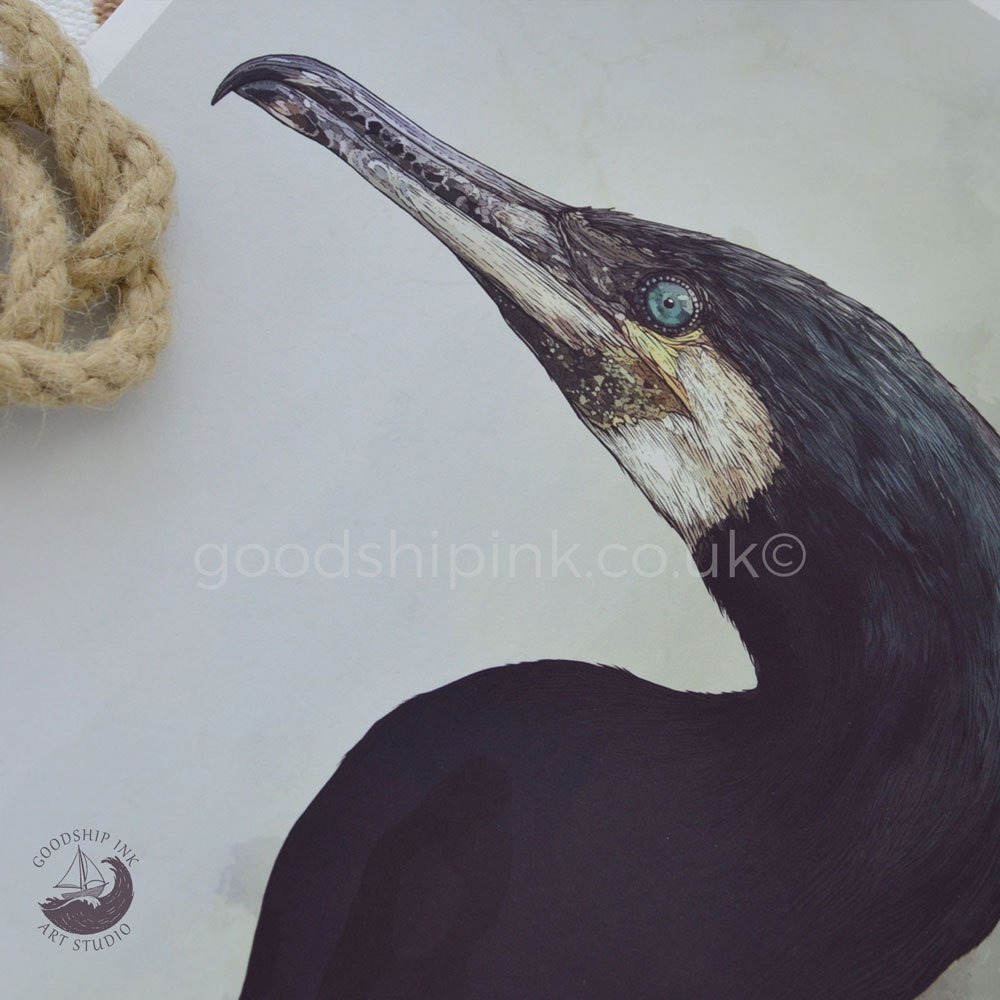 Portrait of a Great Cormorant Art Print — Limited Edition Giclée Print, Hand-drawn Bird Illustration, British Seabird Wall Art. Available in A4/A3/8×10.