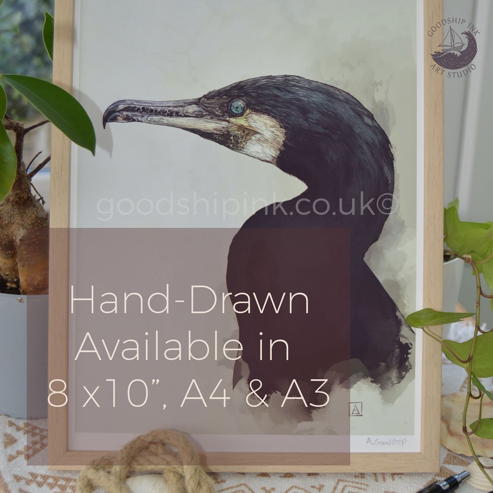 Portrait of a Great Cormorant Art Print — Limited Edition Giclée Print, Hand-drawn Bird Illustration, British Seabird Wall Art. Available in A4 / A3 / 8×10.