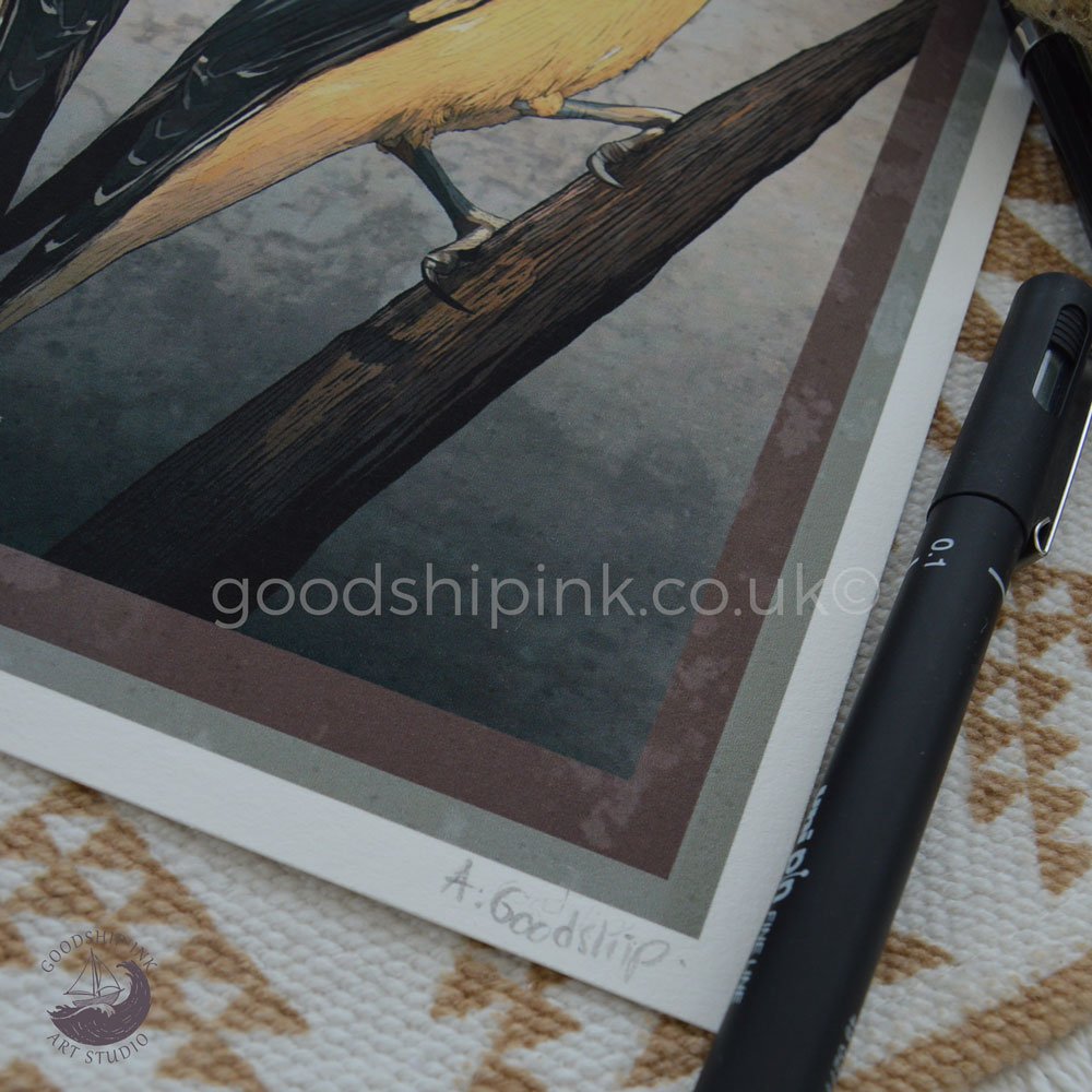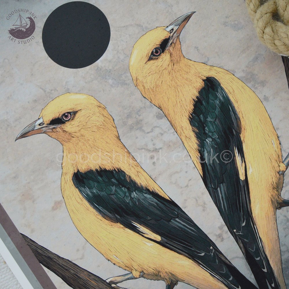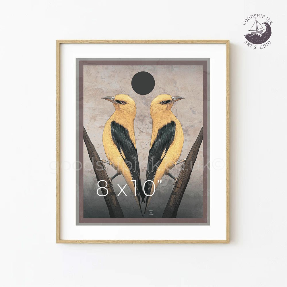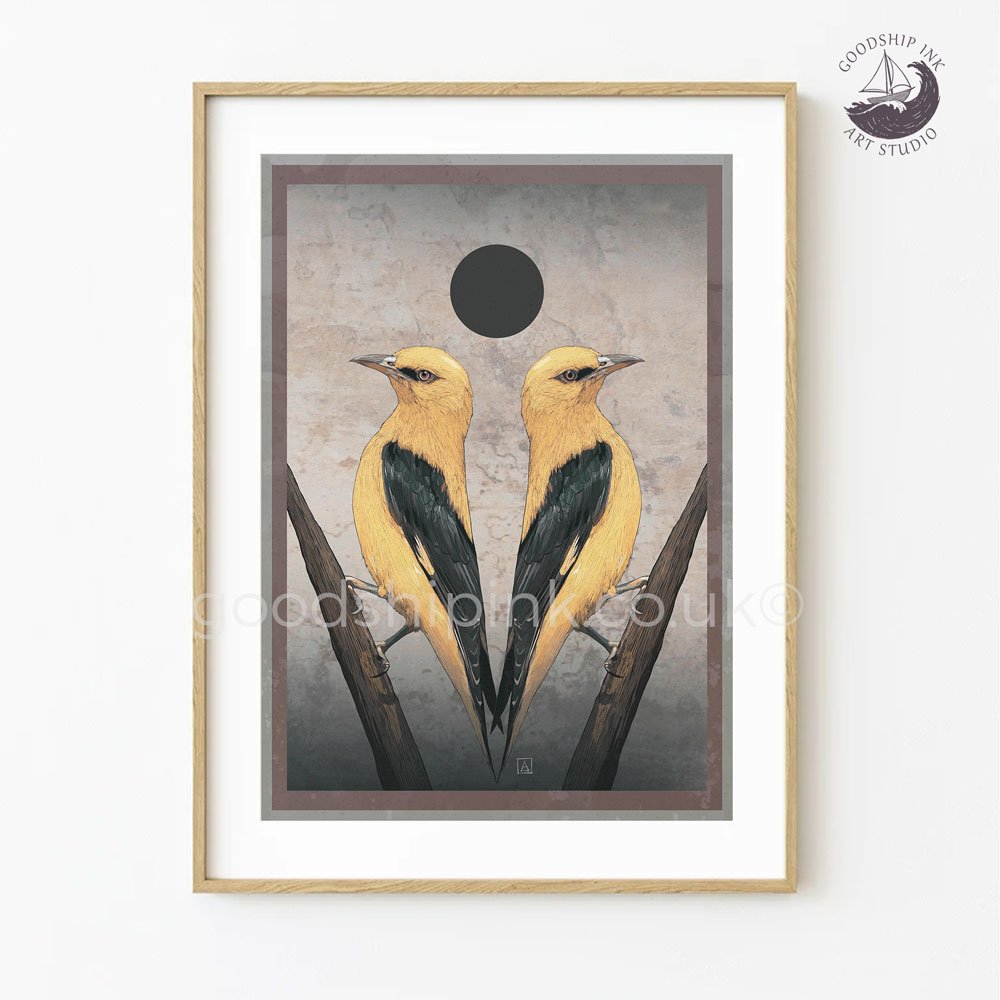 Yellow Orioles, a limited edition Giclée art print from an original hand-drawn illustration by Andrew Goodship. Featuring twin Oriole birds in a tarot-inspired composition.
